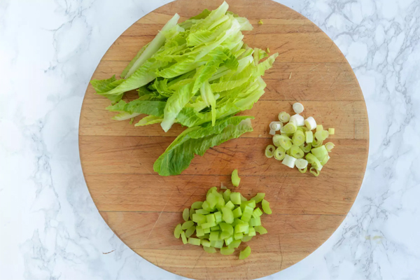 Bước 4: Thái nhỏ cần tây và hành lá. Tách lá rau diếp, nếu lá rau to có thể thải nhỏ hơn.