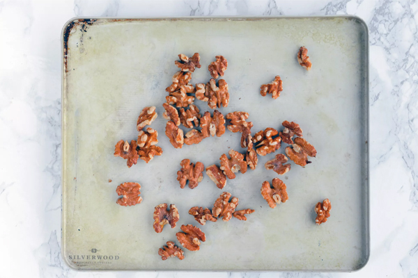Bước 2: Nướng hạt óc chó trên một khay nướng nhỏ. Nướng trên giá giữa lò trong 7 phút. Hạt óc chó phải có màu vàng nâu đẹp mắt. Nếu màu quá đậm, hạt sẽ bị đắng.