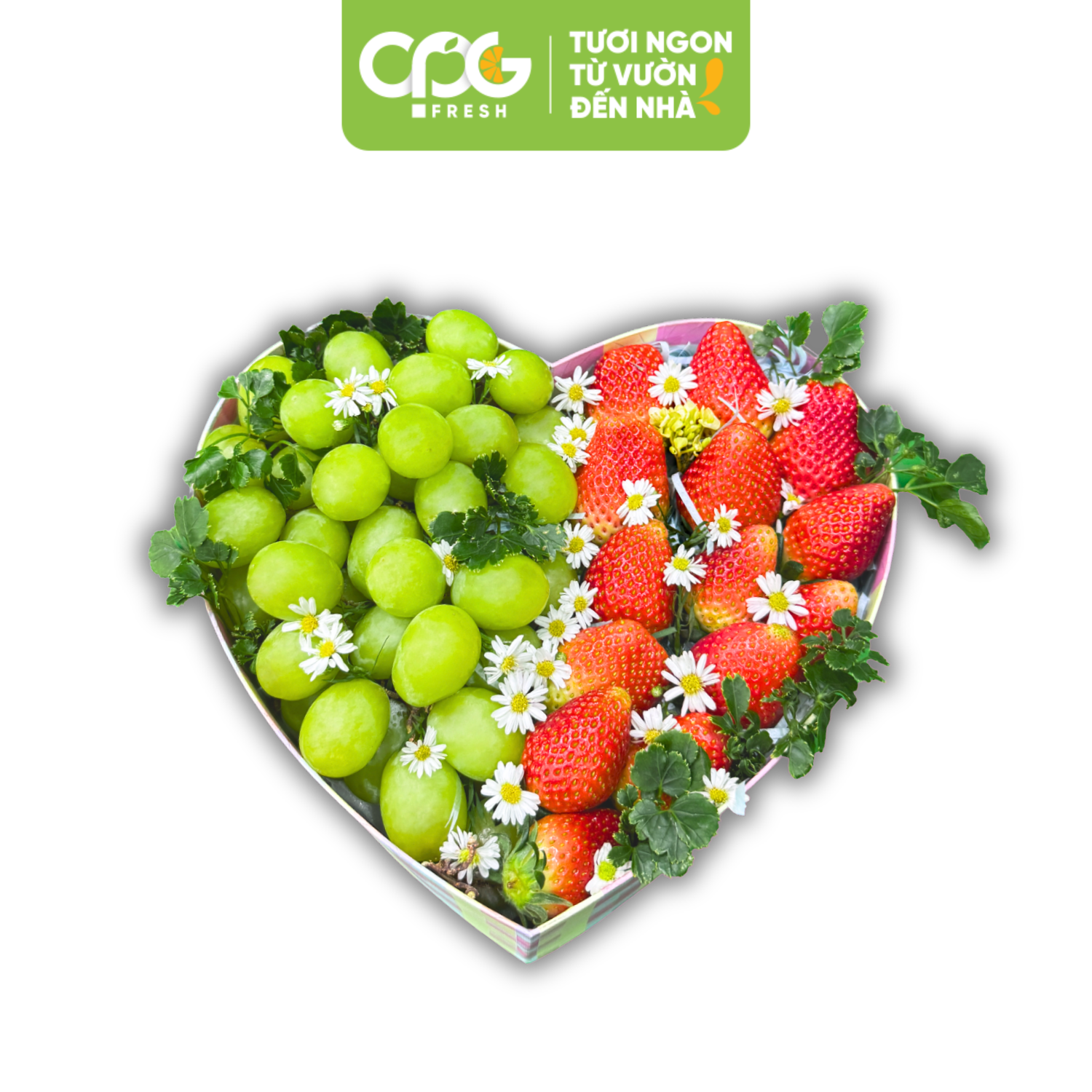 Quy cách: 700gr nho Úc + 330gr dâu tây Hàn Quốc + hộp tim nơ + túi giấy + hoa lá trang trí
